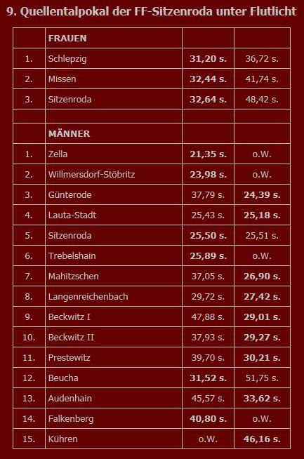 Zum zweiten Lauf der Extraliga führte es uns zu unseren Freunden nach Sitzenroda. Wie nicht anders zu erwarten, fanden wir optimale Wettkampfbedingungen vor. Den Anfang der Wettkämpfe machten die Teams aus Zella und Klein Radden, wo es aber bei beiden Teams Probleme gab und somit Ihre Läufe, mit nicht zufriedenstellenden Ergebnissen beendeten. Trebelshain, als „inoffizieller Gastgeber“, machte es da schon deutlich besser. Sie erreichten eine Zeit von 21,86 sec. Das Team Firesport konnte jedoch noch eine Schippe drauflegen. Sie erreichten eine Zeit von 20,53 sec und setzten sich damit, berechtigt an die Spitze des Feldes. Für uns wurde es im letzten Lauf, allein gegen die Uhr, ernst. Jedoch schlichen sich bei uns, wie auch bei vielen anderen Teams an diesem Tag, Fehler ein. So gab es Probleme beim Kuppeln des Verteilers. Damit war eine Zeit im Spitzenbereich Geschichte und wir beendeten den Lauf in 25,44 sec. Der anschließende zweite Durchgang wirbelte das Feld noch einmal kräftig durcheinander. Zella und Klein Radden machten wieder den Anfang und verbesserten jeweils Ihre Zeiten. Für Zella reichte es am Ende zu einer Zeit von 21,75 sec und für Klein Radden zu einer Zeit von 20,99 sec. Die darauf folgenden Teams konnten sich zwar stellenweise auch noch verbessern, jedoch reichte es nicht, um die Spitzenpositionen zu gefährden. Für uns hieß es also im letzten Lauf noch einmal alles mobilisieren, um die Zeit vom Team Firesport unterbieten zu können. Vom Aufbau her gelang uns diesmal auch alles ohne Fehler und auch beim Spritzen gab es keine Probleme. Am Ende stoppte die Zeit bei 20,19 sec. Damit war der erste Sieg bei der Extraliga 2015 für uns perfekt. In der Frauenwertung konnte die Mixmannschaft aus Missen den Sieg für sich verbuchen.Ab 18 Uhr ging es dann mit dem 9. Quellentalpokal der Feuerwehr Sitzenroda weiter. Gleich im ersten Lauf des Abends gingen wir an Start. Mit einem nicht ganz fehlerfreien Lauf erreichten wir eine Zeit von 23,98 sec. Zella konnte diese Zeit noch unterbieten. Ihnen gelang eine Zeit von 21,35 sec. Bei den restlichen Teams die an den Start gingen, waren ebenfalls einige Fehler zu erkennen, sodass wir den ersten Durchgang auf dem zweiten Platz beendeten. Bei den Frauen ging es da deutlich spannender zu. Hier lagen alle drei Teams innerhalb von rund 1,6 Sekunden. Die glücklichen Siegerinnen waren die Frauen aus Schlepzig, gefolgt von Missen und Sitzenroda. Im zweiten Durchgang war es unser Ziel, die Vorlaufzeit zu verbessern. Leider gab es Probleme beim ausziehen der B-Schläuche und am Verteiler, was ein beenden des Laufes nicht mehr möglich machte. Somit blieb Zella, die auf einen zweiten Lauf verzichteten, an der Spitze des Feldes und wir auf dem zweiten Platz. Dritter wurde die zweite Thüringer Mannschaft aus Günterode. Zu guter Letzt möchten wir noch allen teilnehmenden und erfolgreichen Mannschaften zu Ihrer Leistung gratulieren. Auch dem Gastgeber ist ein riesen Lob für die hervorragende Organisation und tolle Versorgung, über den gesamten Tag, auszusprechen. Wir freuen uns schön auf das kommende Jahr in Sitzenroda.